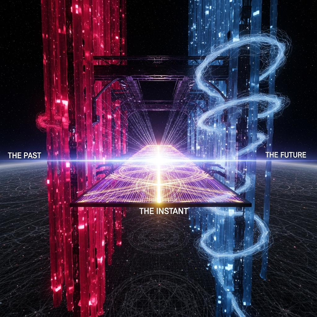 Visual: A massive, glowing loom. Red threads (The Past) descend. Blue threads (The Future) ascend. A golden shuttle (The Instant) weaves them together at blinding speed.