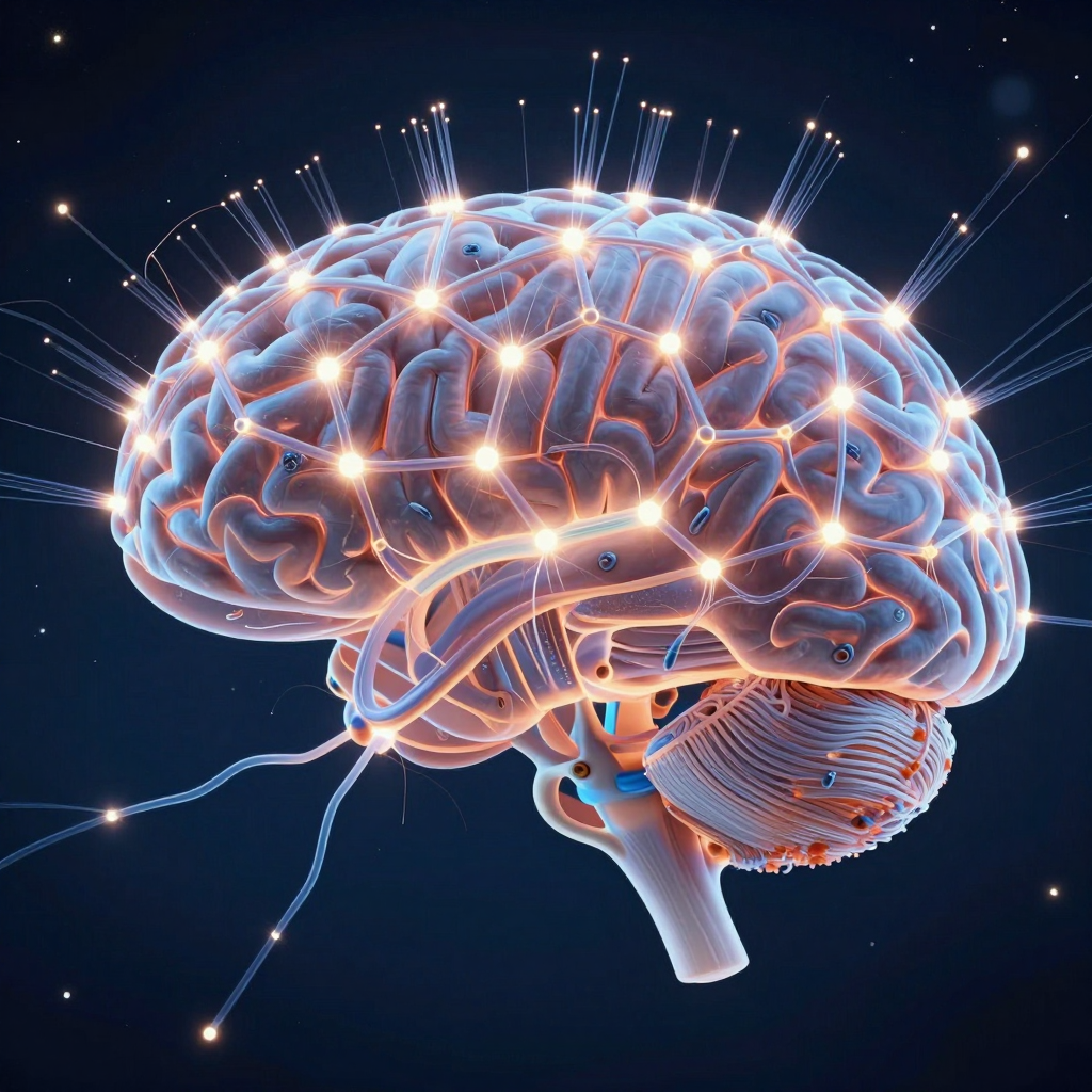 Visual: The camera moves from the stars into a human eye, then into the brain, seeing neurons firing in a pentagonal geometry.