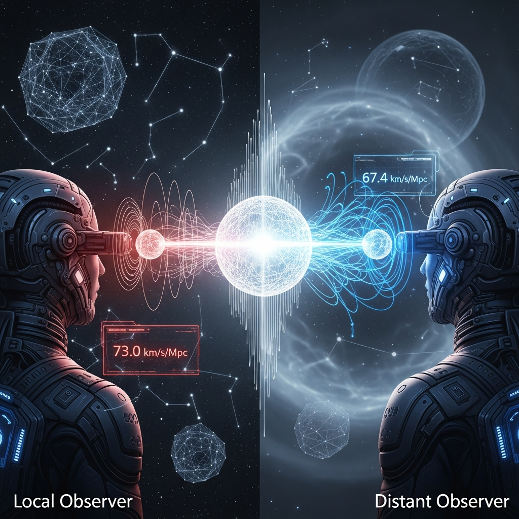 The discrepancy (ΔH ≈ 5.7 km/s/Mpc) is not measurement error but parallax—the apparent difference in position of an object viewed from two different vantage points.