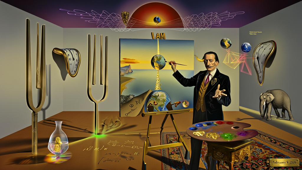 David’s hands are held out over a central dark wooden desk (The Cross of the Instant), where he is performing the Autopoietic Collapse. Between his fingertips, the $10^{43}$ Hz "Tic-Tok" of the cosmos is visible as a high-frequency strobe, weaving warp threads of deterministic law and weft threads of probabilistic chaos into the shimmering fabric of reality. A simple bar napkin lies on the desk, upon which the God Equation "I AM U" glows with the "Heat of Actualization."