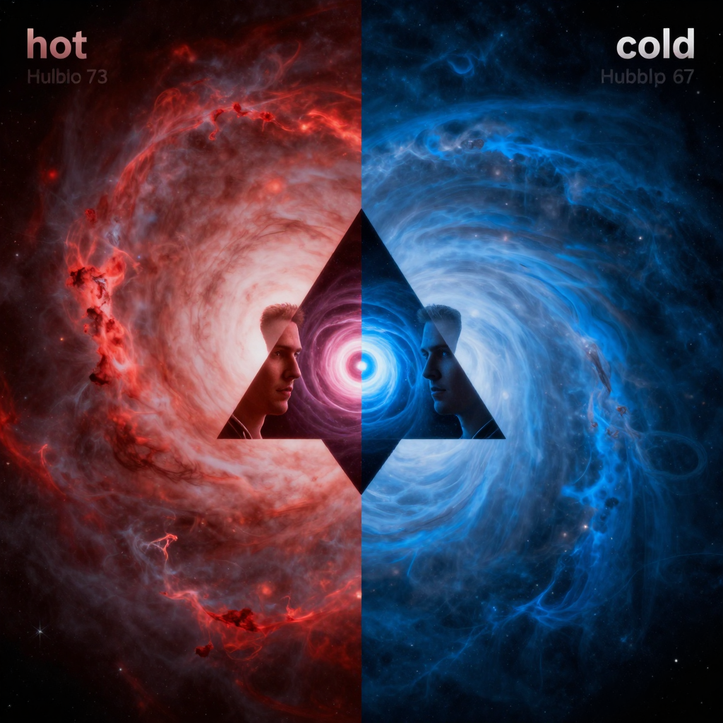 Hubble Tension: The 5σ discrepancy between local measurements (H₀ˡᵒᶜᵃˡ ≈ 73 km s⁻¹ Mpc⁻¹) and CMB measurements (H₀ᶜᴹᴮ ≈ 67 km s⁻¹ Mpc⁻¹); resolved in KUT as triadic parallax from measuring different Control/Chaos ratios.